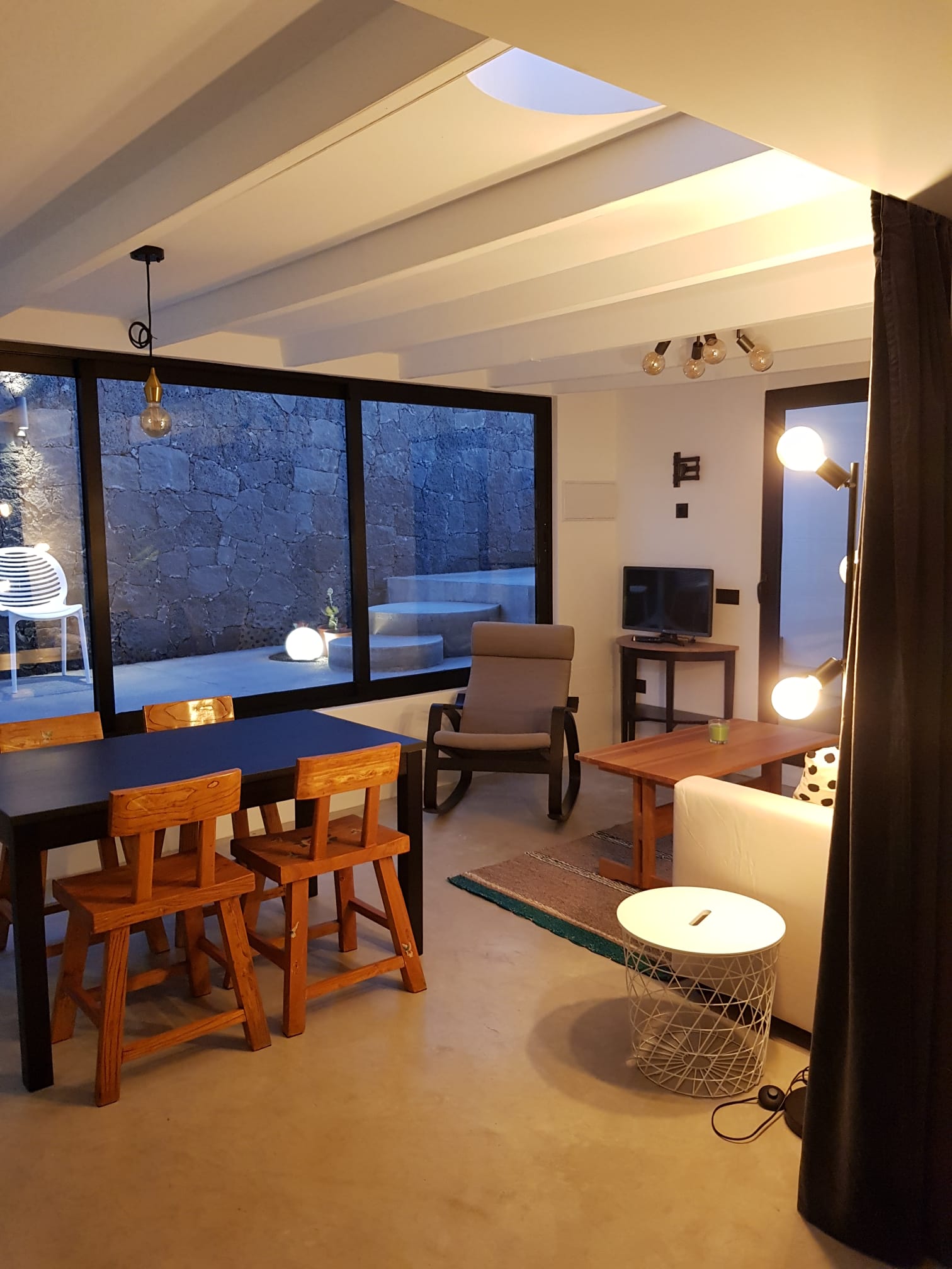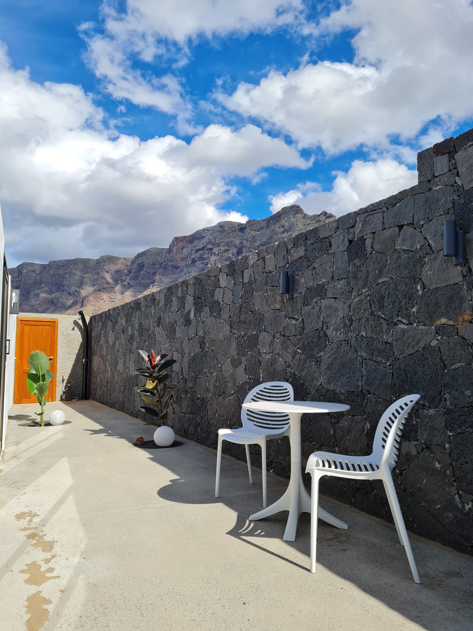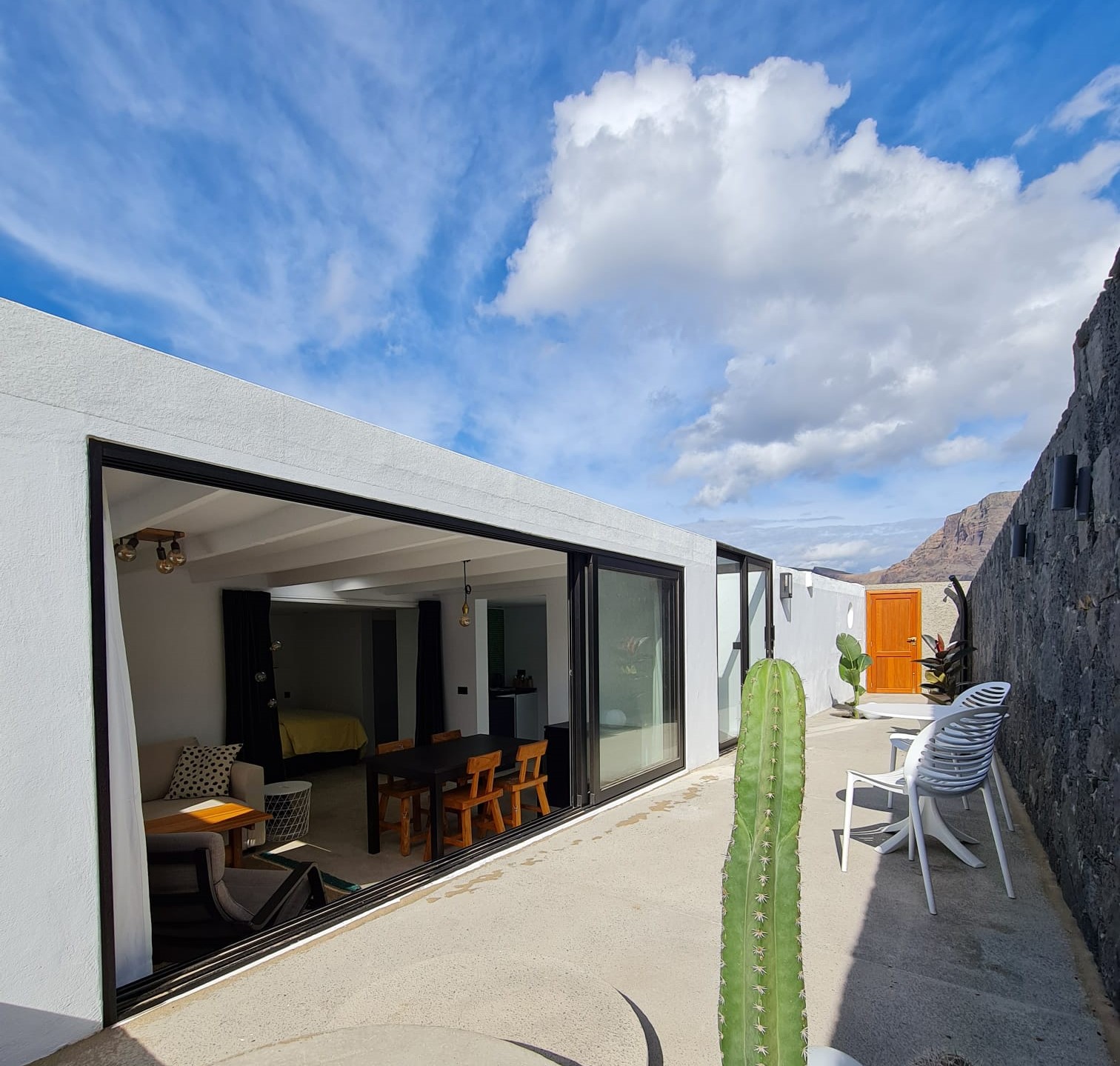 This totally renovated ground floor charming apartment is suitable for 2 to 3 persons (a comfortable sofa-bed) It consists of a large open living and sleeping space (35m²), which is equipped with a double bed, a walk-in closet and a bathroom with shower, sink and an individual WC. The fully equipped kitchen is separate. The terrace with breath-taking view on El Risco with amazing sunrise is an oasis of sun and fresh air.