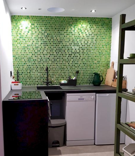 Kitchen: coffee machine, kettle, toaster, oven, fridge with freezer, cookware, dishes & cutlery